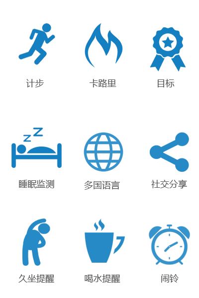 提醒功能:喝水提醒、久坐提醒、鬧鈴提醒